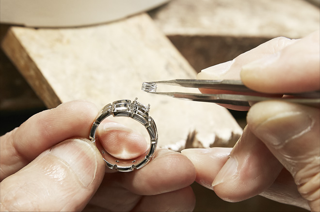 立体的なセッティングやダイヤモンドを留める爪の位置など、細部にまで職人の技巧を尽くしてジュエリーに仕上げています。