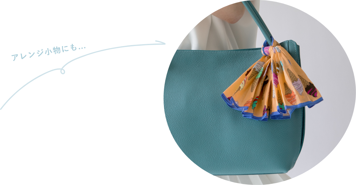 豊富なカラーバリエーションのなかでも、幅広い層から人気なのが“アクアカラー”です。主張が強すぎないグレイッシュなトーンなのでさまざまな色合わせがしやすく、甘くなりすぎずに大人にちょうどいいバランスのアクセントアイテムとしても有効。着こなしから浮いてしまうことなく、凛とした気品をシーズンレスに演出します。鮮やかカラーのハンカチーフをハンドルにアレンジすれば、自分らしいコーディネートも楽しめます。