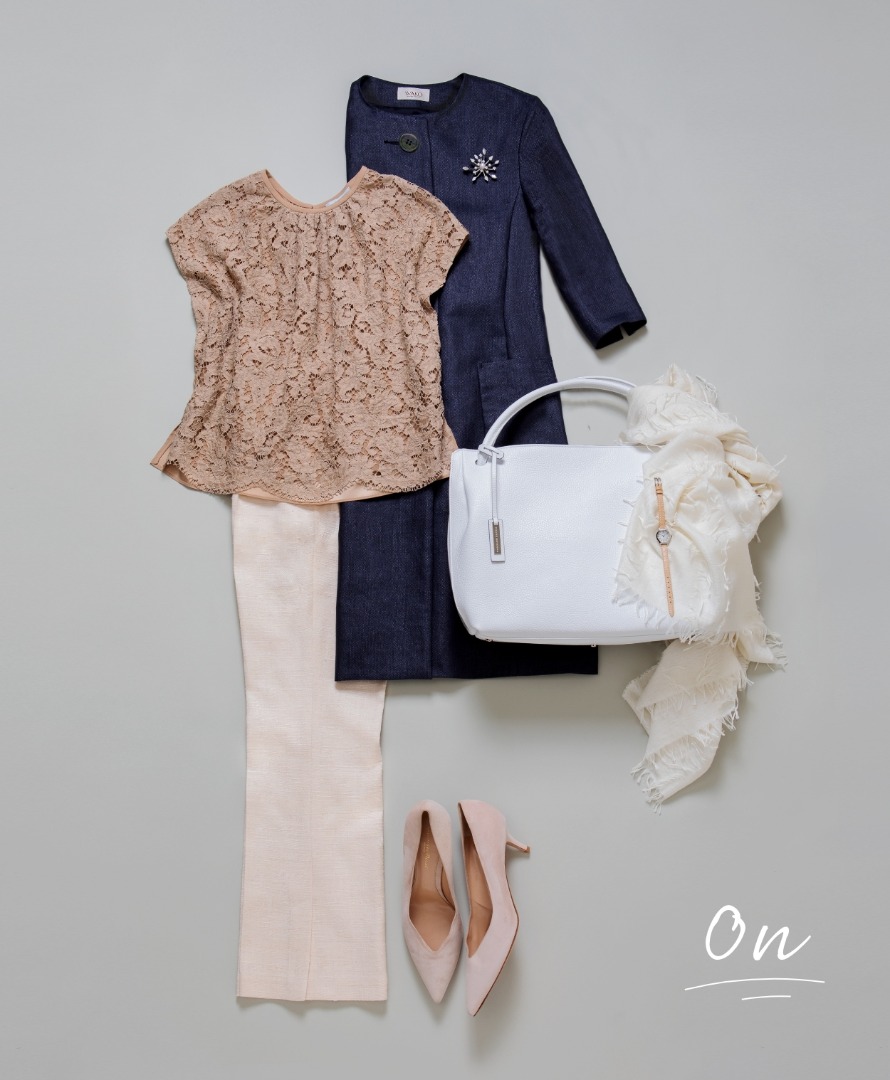 ビジネスや会食などオンのシーンで、真っ白のシュリンクレザーのバッグは美しく映え、白の小物を丁寧に扱うことは上品な身のこなしにもつながります。バッグのよどみのない色合いは、ネイビーのジャケットやレースのトップスのフォーマル感を、適度に柔らかく見せる効果も。きちんと見えて抜け感もある、バランスの良いおしゃれを完成させます。