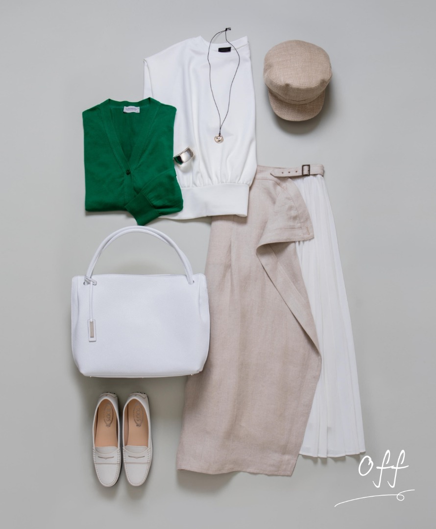 キャスケットとお気に入りカラーのコットンカーディガンを纏い、美術館やカフェで過ごすオフの日。遊び心のあるアイテムを取り入れた休日スタイルにも、白いシュリンクレザーのバッグをプラスしてみるのはいかがでしょう。上品でクリアな白の効果で、カジュアルすぎず、程よくきちんと感のある着こなしにランクアップできます。